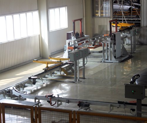 摩擦式滚筒积放输送机主要包括驱动电机、套筒滚子链条、精密积放滚筒、铝合金整体旁板、机架,其中驱动电机、套筒滚子链、传动链轮、精密积放滚筒依次相接,精密积放滚筒通过轴承安装在铝合金主旁板上,铝合金主旁板安装在机架上。本实用新型的优点:与传统的积放滚筒输送机相比,加工精度高,其运行径向跳动小,积放力矩可调,整机结构紧凑,日常运行能耗较小,运行噪音较小,日常维修保养工作量小,在输送铝合金缸体零部件时不会碰伤铝合金缸体的精密加工面,从而能很好地适应铝合金缸体的机加工线的工件输送需求。